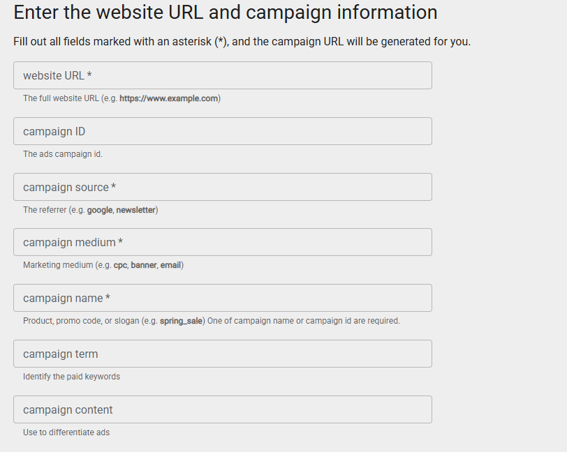 - Open the Google UTM builder: https://ga-dev-tools.google/campaign-url-builder/